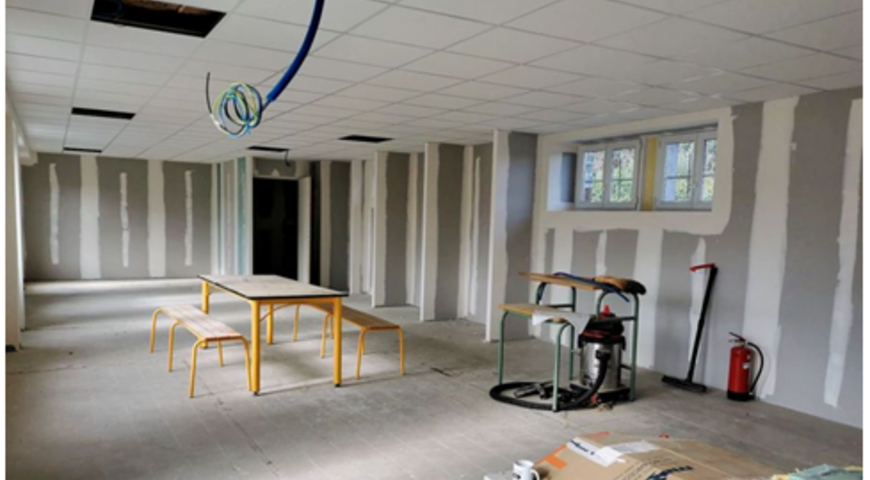 Dans la continuité des travaux de rénovation de 2007, nous avons débuté fin d'année 2021 la réfection totale de la garderie-salle de motricité, ainsi que le changement du système de chauffage et la sécurisation de l'accès à l'école.