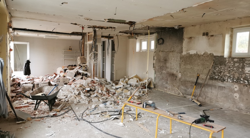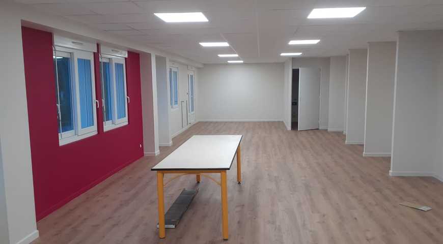 Notre objectif était de refaire l'isolation complète de la salle, l'électricité, la plomberie, la toiture, les sols et les plafonds, le traitement des poutres, la peinture et l'aménagement sans oublier la création d'un sas sécurisé pour l'accès principal de l'école.
