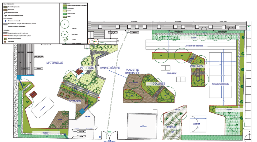Une commission a été mise en place, réunissant direction, enseignants, personnels OGEC, membres de l'OGEC et bénévoles APEL. Différents bureaux d'étude ont été contactés. L'entreprise Alter Bâtir a été retenue. Après une phase d'échanges sur les souhaits concernant l'aménagement, un projet a été retenu et un échéancier mis en place. Dès la rentrée 2024, les élèves de l'école devraient pouvoir profiter d'une cour en grande partie aménagée. Les plantations devraient avoir lieu au cours du dernier trimestre 2024.