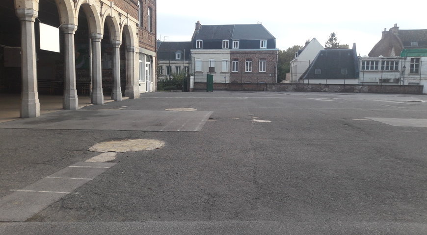 Notre école est une école de centre ville de 8 classes de la Toute Petite Section au CM2 accueillant un peu plus de 200 élèves. Elle est composée de 2 bâtiments avec une grande cour de récréation et un espace pelouse. Ces 2 espaces de jeux sont vides.