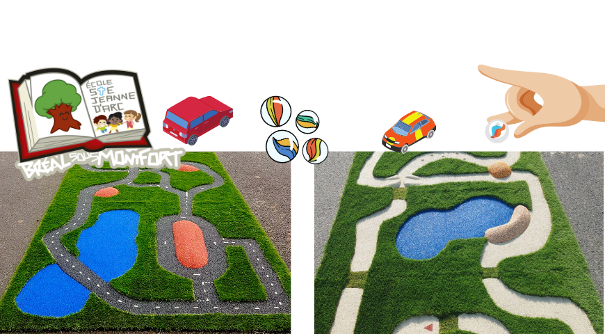 Les cours de récréation sont en grande partie en enrobé… Plus possible de creuser ses trous pour jouer aux billes, comme avant !! Et jouer aux petites voitures