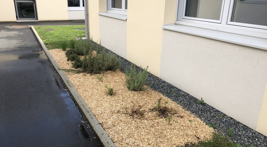 - installer des espaces verts avec des zones non bitumées (sol en copeaux de bois par exemple) et planter des arbres pour créer des zones d'ombre