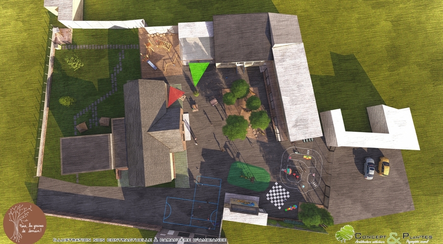 Enlever une surface importante de bitume et décaisser pour planter des arbres et compléter aves des copeaux.