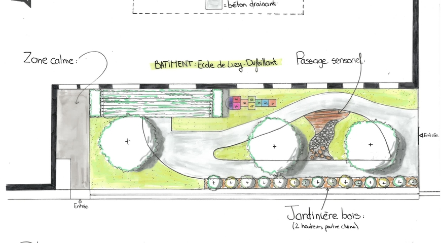Création d'une cour végétalisée avec des matériaux perméables, d'un parcours sensoriel et mise en place de jardinières.
