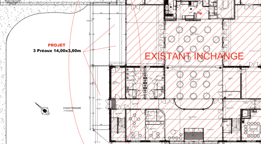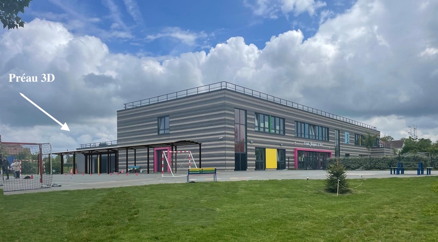 Suite à la croissance des inscriptions depuis l’installation sur les hauteurs de Trouville, le préau actuel de 111 m2 est devenu trop exigu pour les élèves de primaires (< 0,5 m2 par élève). Une structure en aluminium et toiture transparente viendra se greffer à la construction actuelle pour une surface totale de plus de 260 m2 (soit plus de 1,15 m2 par élève).