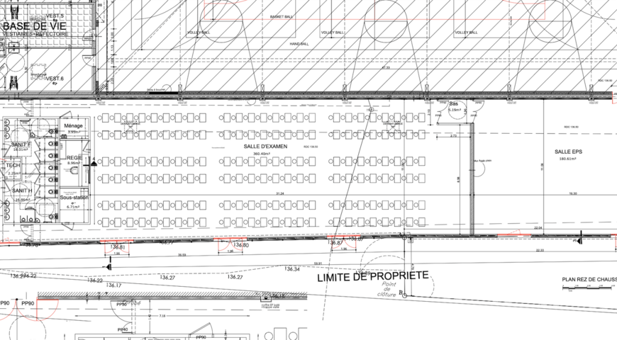 Une nouvelle construction d’une surface de 570 m2 viendra s’ajouter au bâtiment abritant actuellement le gymnase. Elle sera composée de deux parties : une salle d’examen de 377 m2 - répondant aux exigences en vigueur et permettant à tous les élèves de poursuivre leur scolarité dans l’enceinte de l’établissement pendant les périodes d’épreuves - coudoiera une salle de sport (essentiellement dédiée au tennis de table) de 193 m2.
