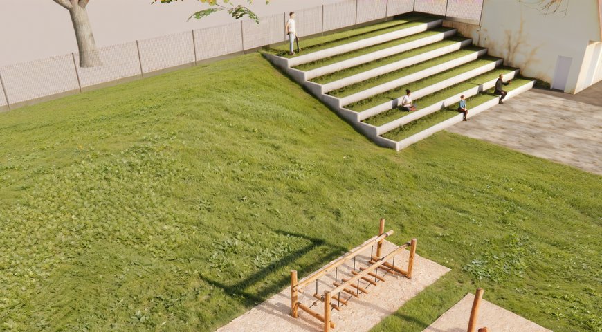 En contrebas des gradins, sur un espace occupé actuellement par de l'herbe, un parcours composé de plusieurs structures en bois sera créé, les enfants pourront s'y amuser.
