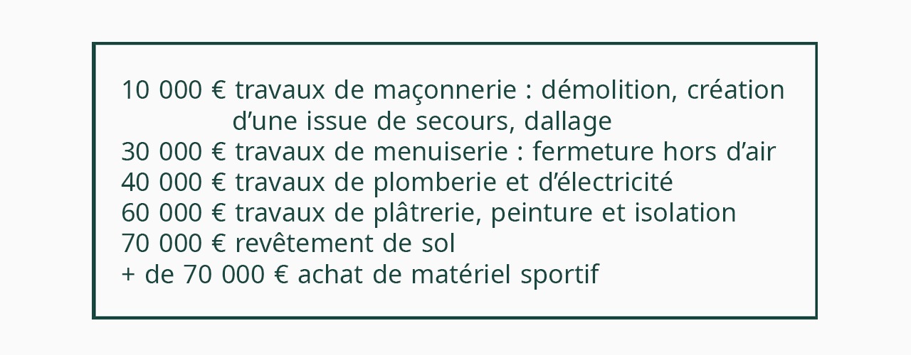 Cette campagne vise à collecter des fonds pour les travaux de maçonnerie, de menuiserie, de plomberie et d'électricité, de plâtrerie, peinture, isolation, de revêtement de sol et enfin du matériel sportif.