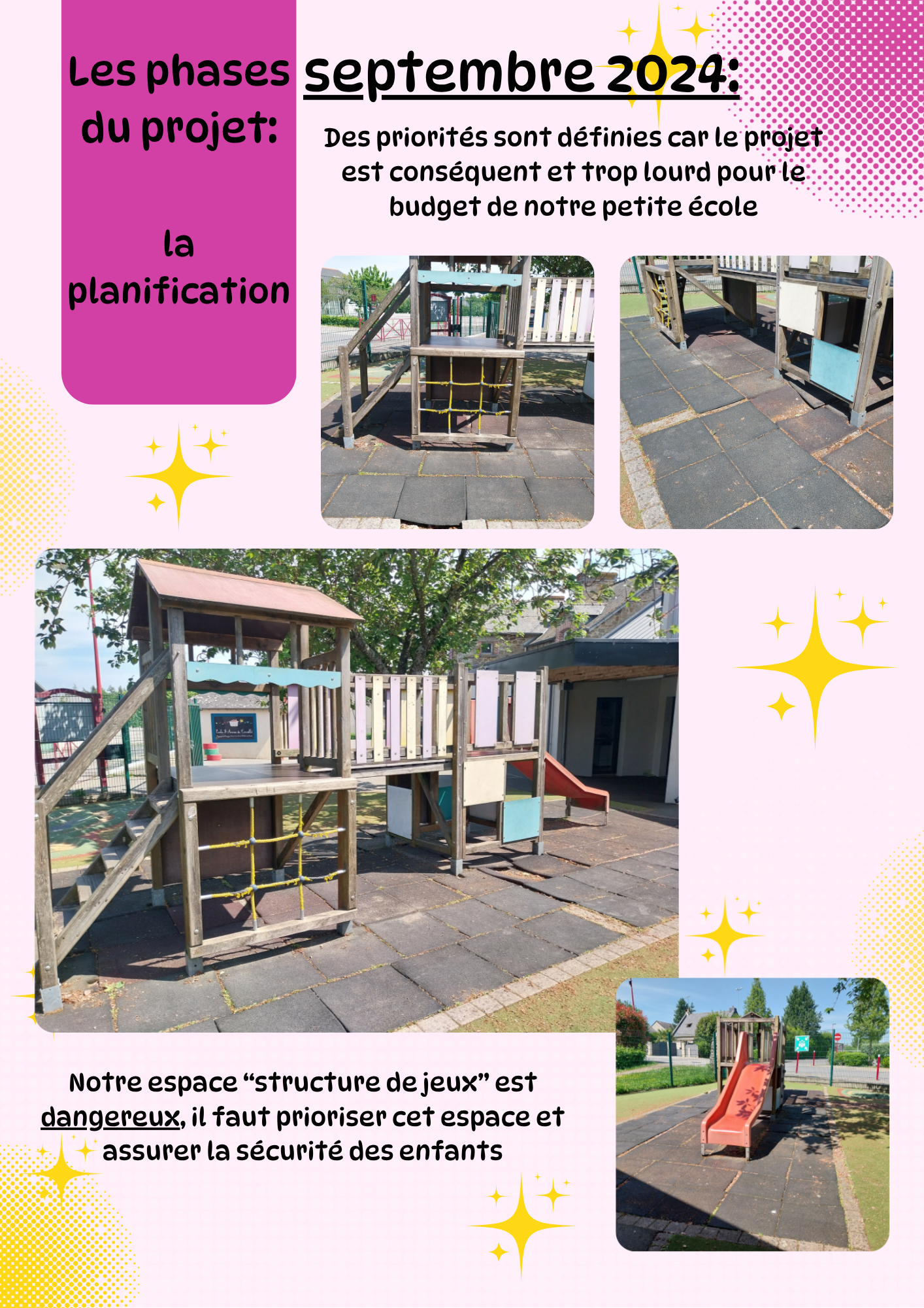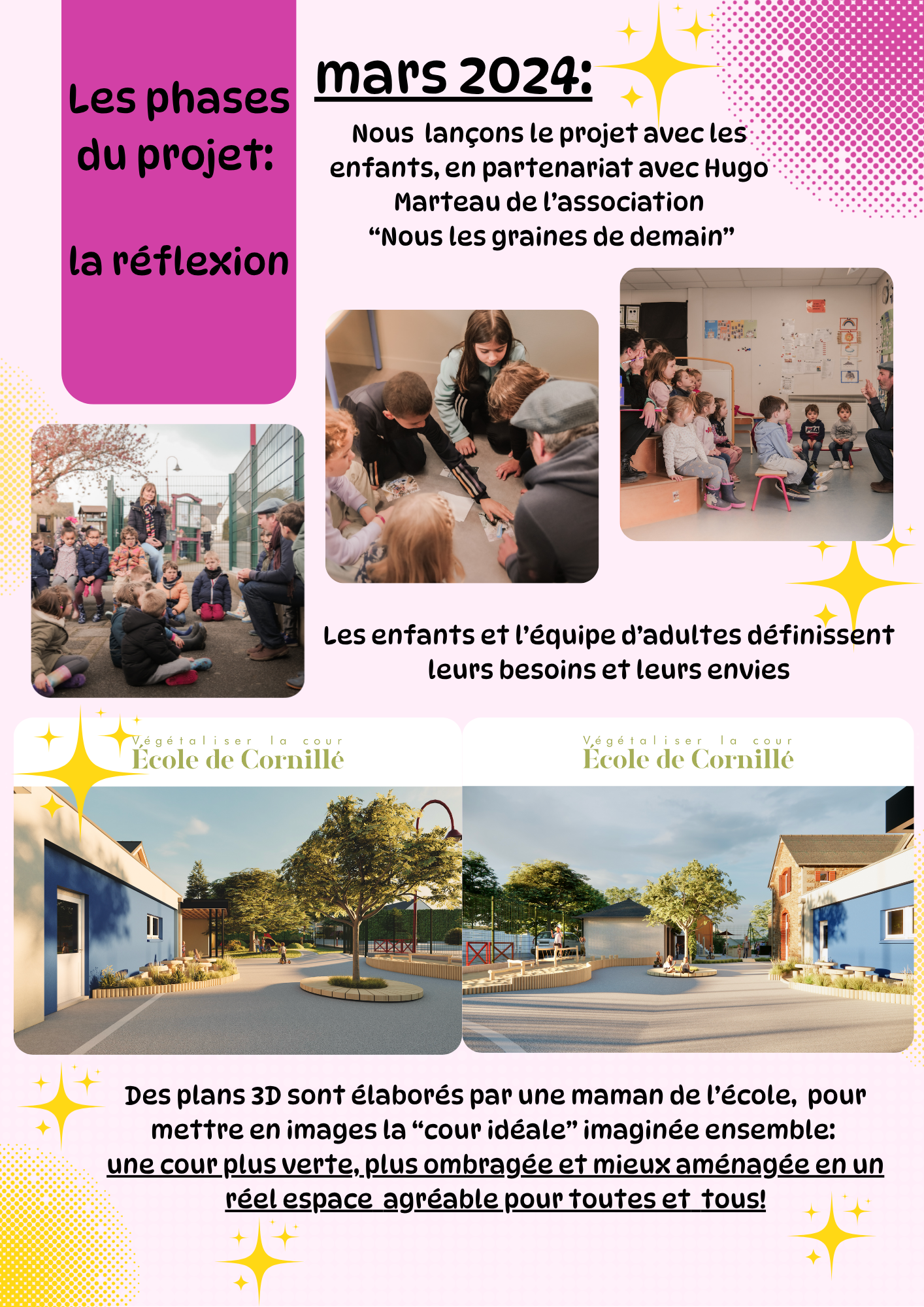 Ce projet a démarré en 2024 où les enfants, l'équipe éducative et les parents des bureaux APEL et OGEC ont entamé une démarche pour repenser la cour de l'école, en partenariat avec l'association "Nous, les graines de demain!". L'objectif est d'imaginer et concevoir une cour plus adaptée à tous, avec des espaces diversifiés (espace sportif, espace calme, espace exploration, espace créatif...) répondant aux normes de sécurité. La volonté du projet est également d'apporter plus de végétal et d'espaces ombragés sur la cour, pour répondre aux besoins relatifs au changement climatique. La priorité est le remplacement de la structure de jeux et la création d'un espace avec des copeaux de bois.