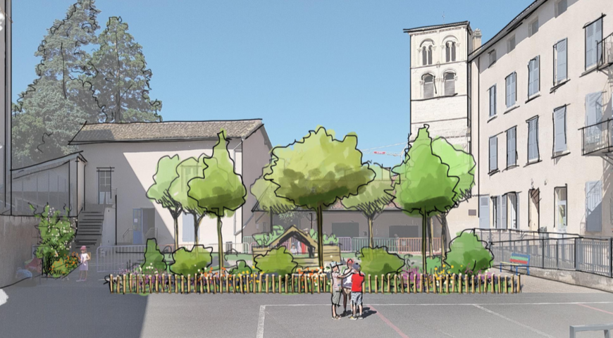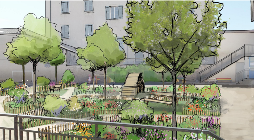 Lutter contre les îlots de chaleur : en plantant des arbres et en ajoutant des zones ombragées, nous rendons la cour plus agréable en été.