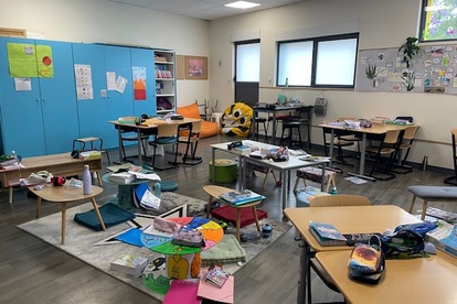 Dans nos classes, on enlève les tables et les chaises classiques pour faire de la place pour d’autres espaces plus confortables et modulables afin de favoriser l’intégration des élèves quel que soit leur profil (dys, TDA ou handicap), afin de faciliter leur bien-être et leur réussite, afin de renforcer leur estime.