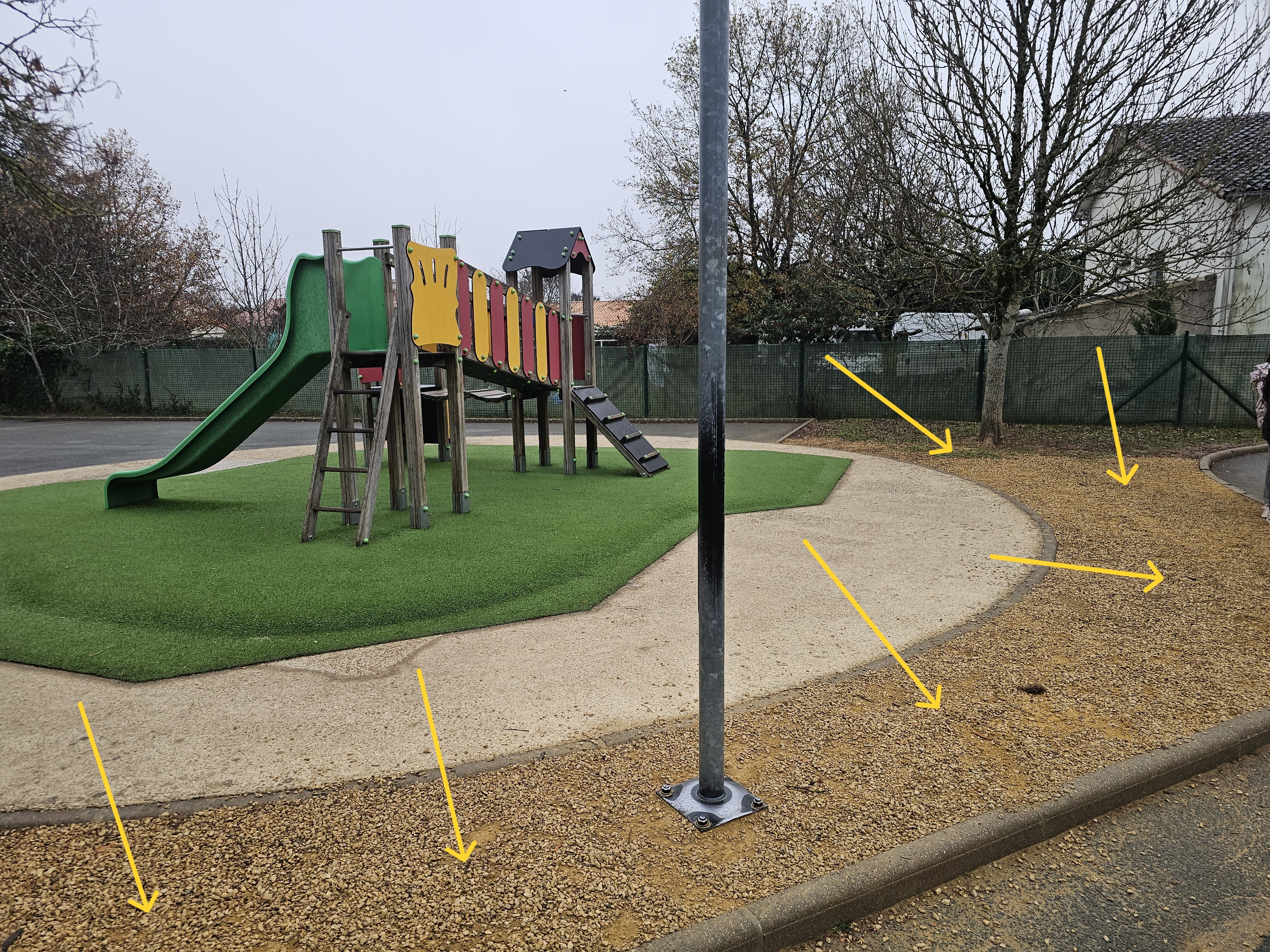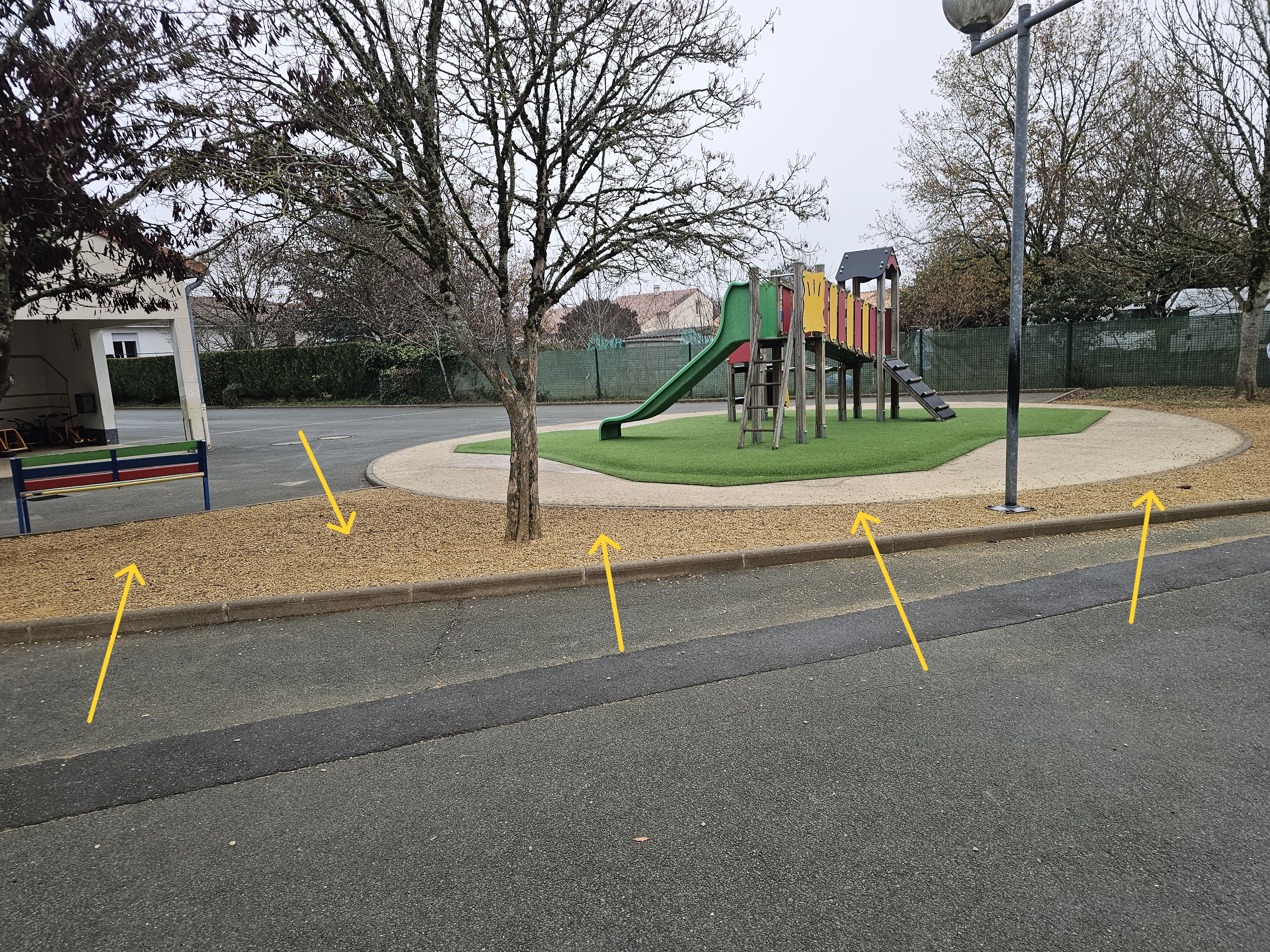 Il s'agit de ré-aménager l'espace séparant la cour des maternelles de celle des élémentaires (voir photos ci-dessous). Celui-ci, vieillissant et subissant des aléas climatiques grandissants, engendre des contraintes supplémentaires au quotidien pour les personnels en charge de la surveillance des récréations. De facto le temps consacré aux enfants est moindre.