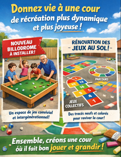 Grâce à votre soutien, la cour deviendra un véritable lieu d’épanouissement, favorisant le jeu, le respect des règles et le vivre-ensemble au quotidien.