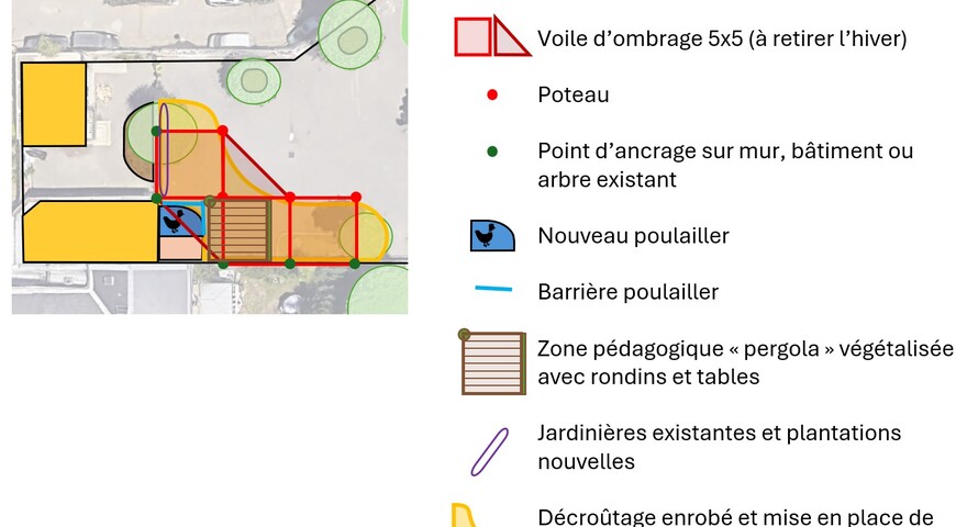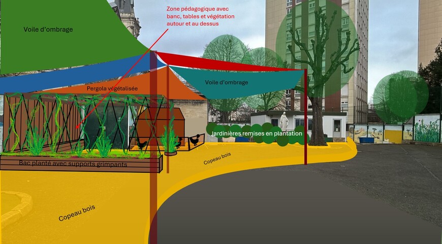 Le projet consiste à aménager au cœur de la cour une structure ouverte, légère et végétalisée. Ce ne sera pas seulement un abri, mais un véritable espace apaisé et frais où l'on vient pour apprendre, observer et respirer.