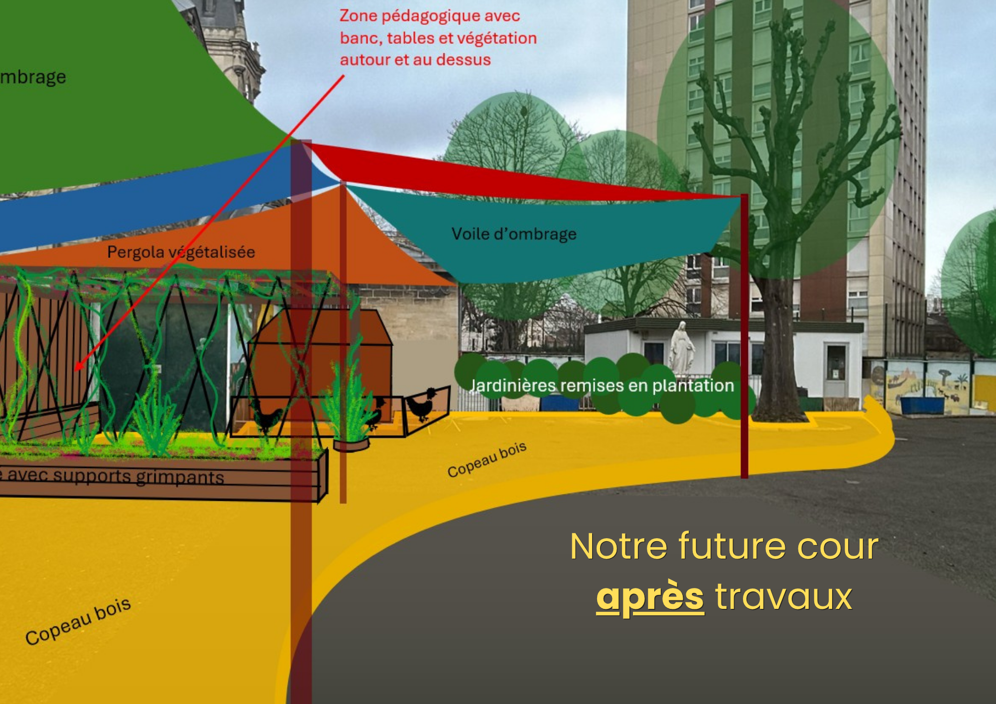 Investir dans le projet "Création d'une cour oasis avec une classe-ouverte", c'est transformer la cour de l'école Sainte-Marthe en un îlot de fraicheur, apaisant pour les enfants pour faire face aux enjeux du changement climatique. C'est aussi offrir aux enfants la chance de grandir dans un environnement améliorant leur confort d'apprentissage quotidien.